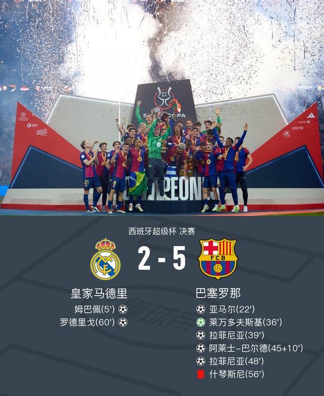 這是本賽季雙方的第二次交手,聯(lián)賽中首回合巴薩4-0大勝皇馬,本場(chǎng)比賽皇馬也志在復(fù)仇。姆巴佩的進(jìn)球讓皇馬看到了復(fù)仇的可能,但隨后巴薩就接管了比賽,他們連續(xù)打進(jìn)5球,而皇馬只在巴薩十人應(yīng)戰(zhàn)后由羅德里戈打進(jìn)第二球,就這樣,巴薩單賽季第二次戰(zhàn)勝皇馬,并且?jiàn)Z得了西超杯冠軍。