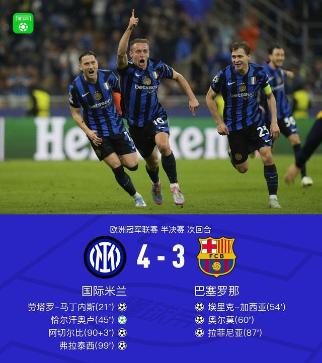 1、24/25賽季歐冠半決賽次回合:國(guó)米4-3巴薩晉級(jí)歐冠決賽 熱度值:3868750